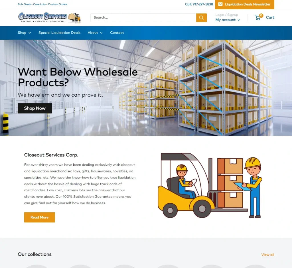 To achieve this, we started by migrating the existing online store from Bigcommerce to Shopify platform. Once the migration was complete, we turned our attention to creating a new design that would truly represent Closeout Services Corp. We chose to work with the premium Shopify theme Warehouse, which provided us with the flexibility we needed to create a unique and compelling online store.
